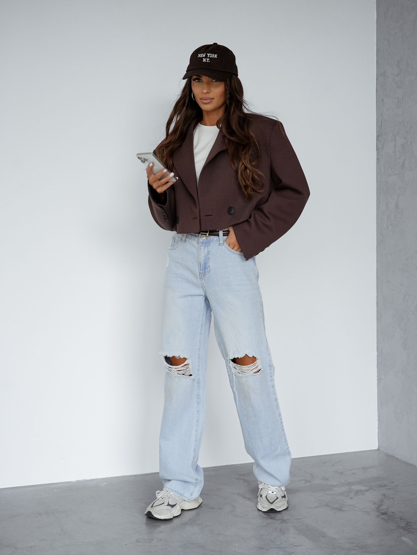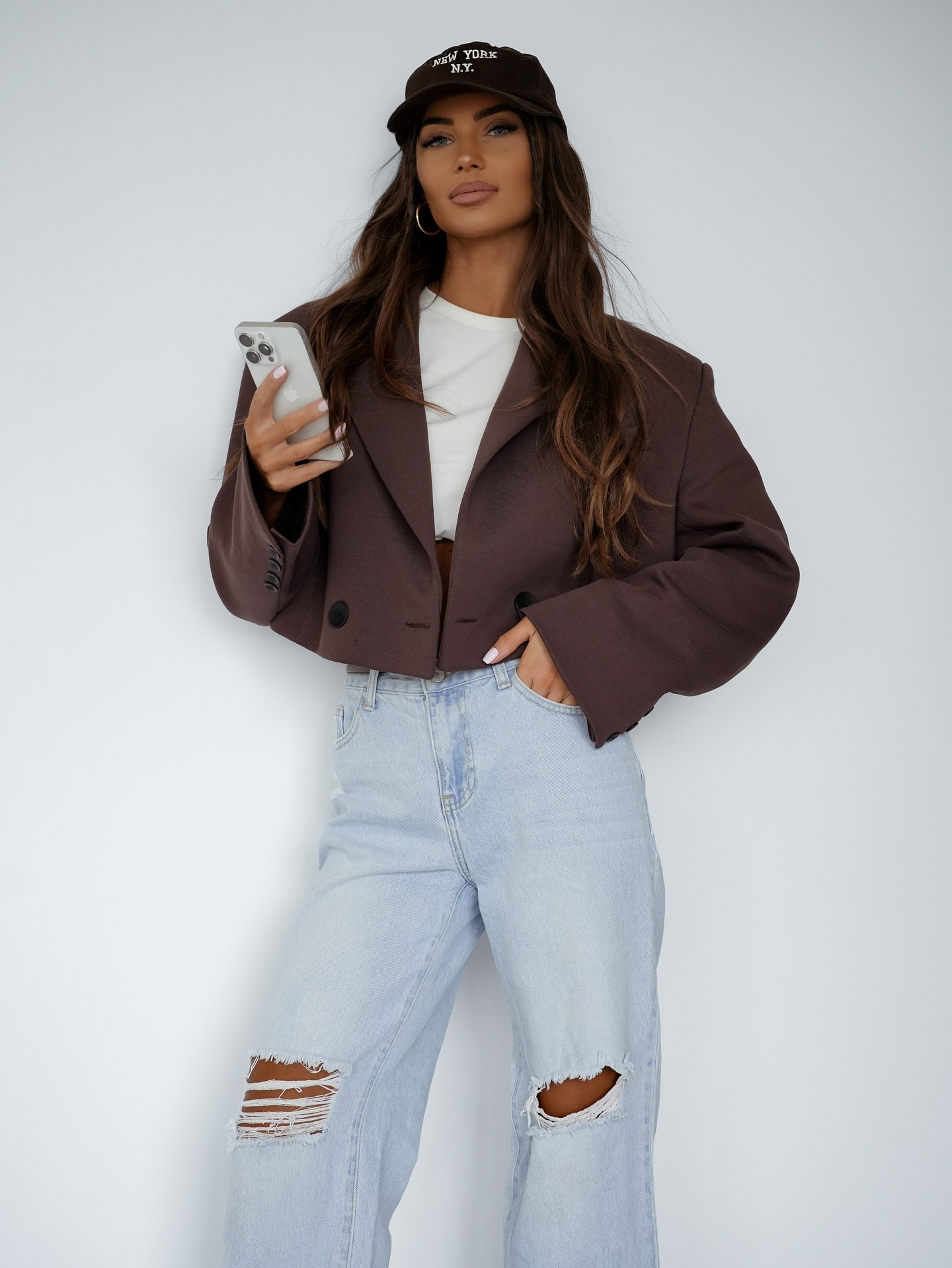 Wykonana z miękkiej dzianiny dresowej, marynarka zapewnia pełen komfort noszenia, a jej luźny, oversize’owy krój wpisuje się w aktualne trendy. Czekoladowy kolor pięknie komponuje się z beżami, kremami, bielą oraz złotymi dodatkami.