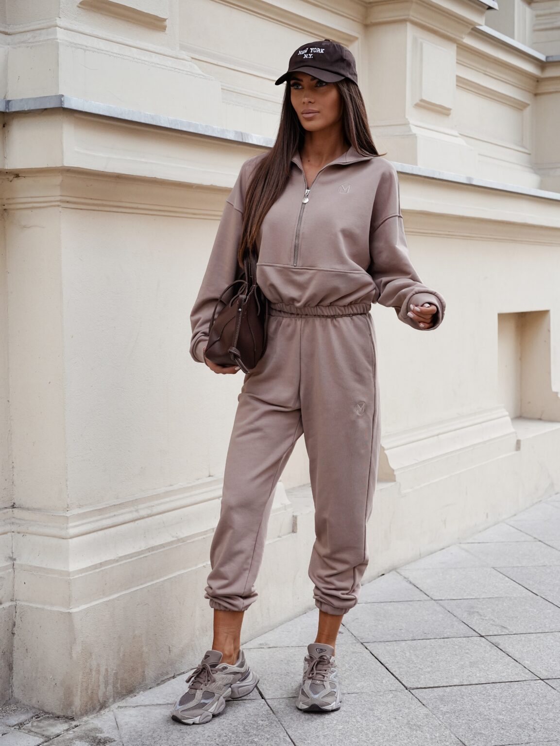 Nowoczesny komplet dresowy w głębokim odcieniu czekolady to połączenie komfortu i miejskiego stylu. Bluza z długim rękawem i stójką zapinaną na suwak nadaje sportowego charakteru i pozwala dopasować fason do okazji – możesz nosić ją rozpiętą lub w wersji bardziej casualowej. Spodnie z elastyczną talią i mankietami przy nogawkach gwarantują wygodę i świetne dopasowanie. Miękka, przyjemna w dotyku tkanina sprawia, że zestaw sprawdzi się zarówno podczas codziennych wyjść, jak i w domowym relaksie. Idealny wybór dla kobiet, które lubią wygodę w modnym, minimalistycznym wydaniu.