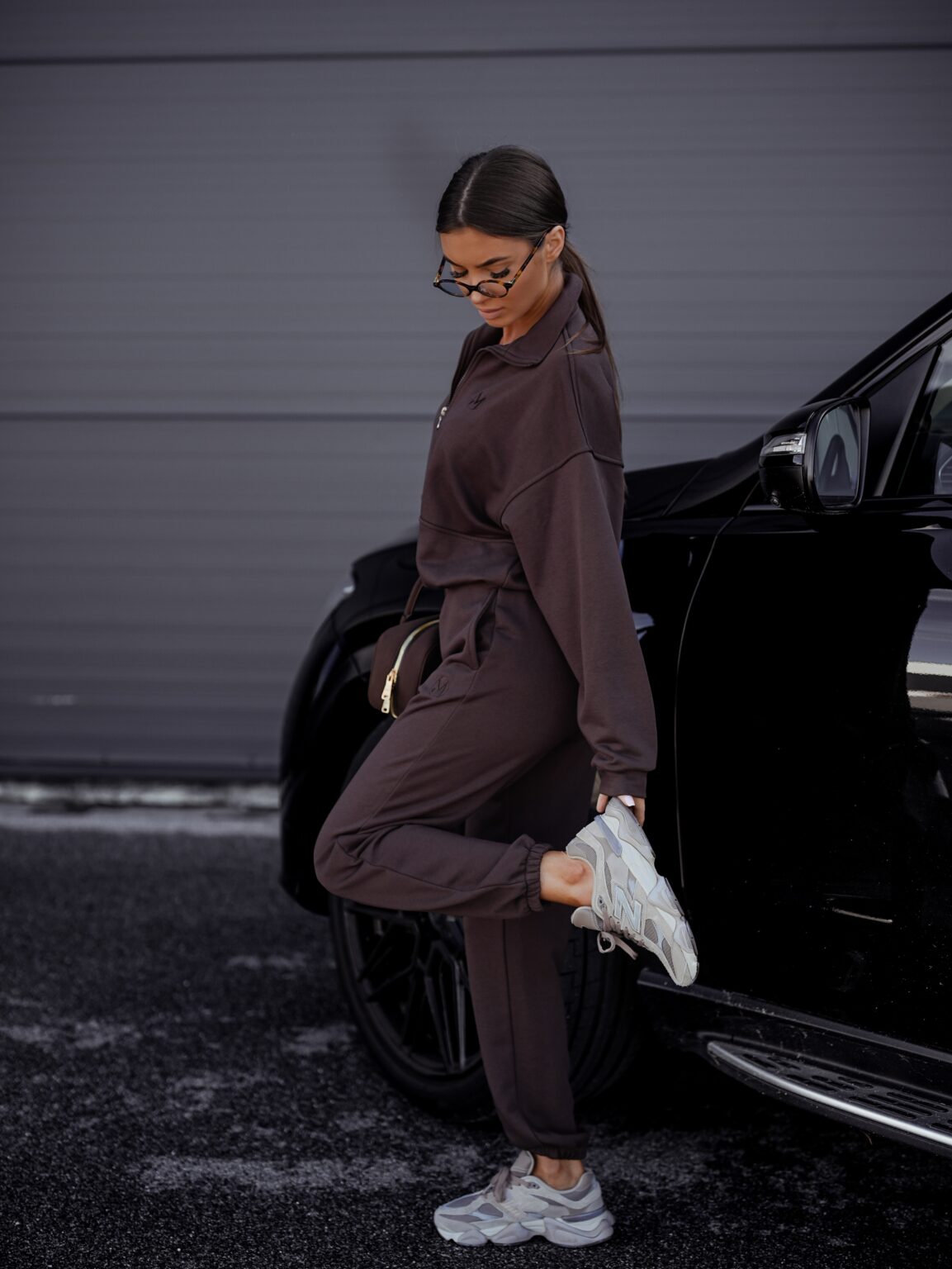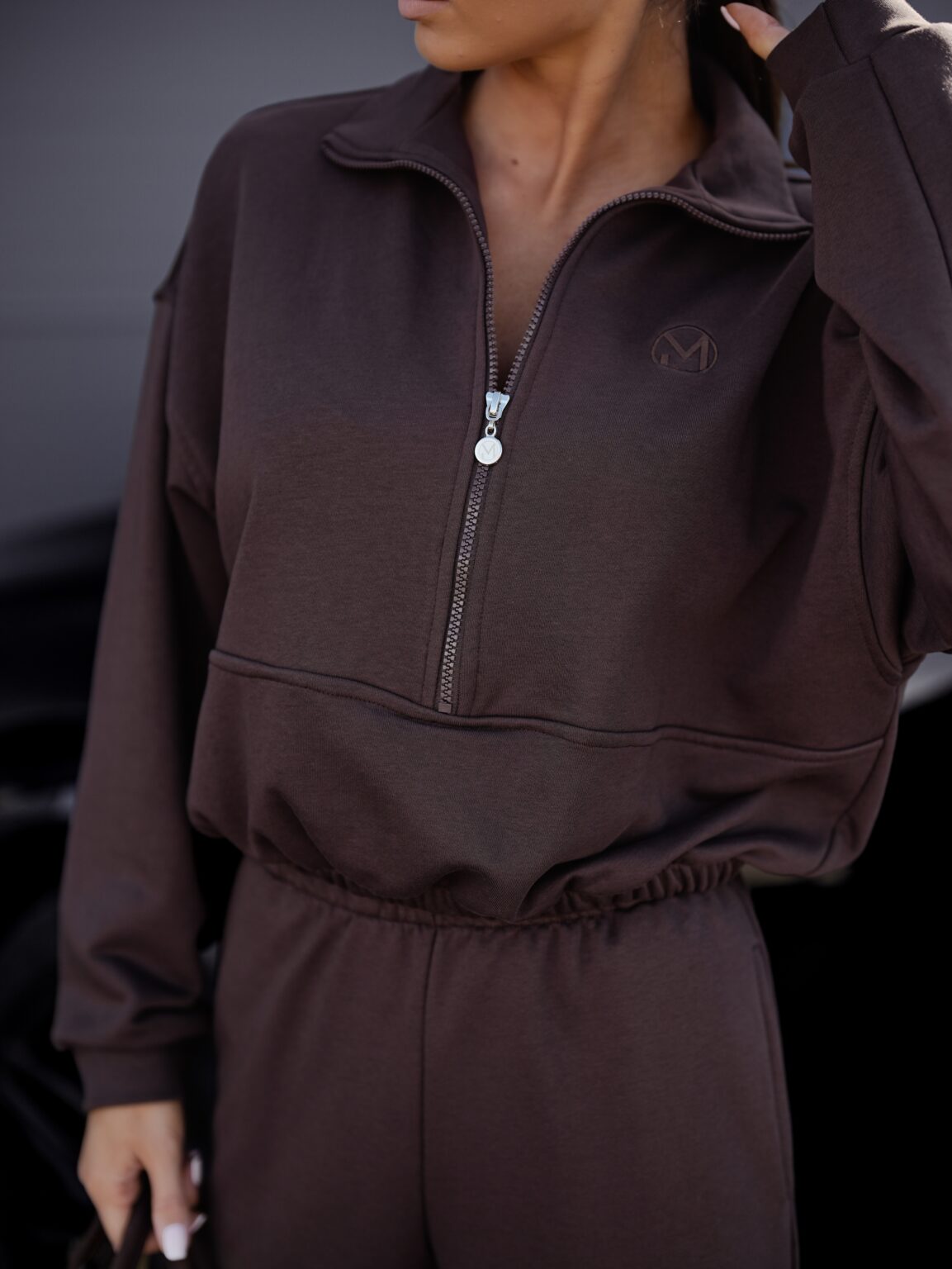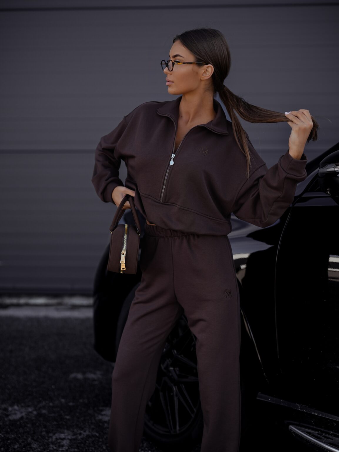 Nowoczesny komplet dresowy w głębokim odcieniu czekolady to połączenie komfortu i miejskiego stylu. Bluza z długim rękawem i stójką zapinaną na suwak nadaje sportowego charakteru i pozwala dopasować fason do okazji – możesz nosić ją rozpiętą lub w wersji bardziej casualowej. Spodnie z elastyczną talią i mankietami przy nogawkach gwarantują wygodę i świetne dopasowanie. Miękka, przyjemna w dotyku tkanina sprawia, że zestaw sprawdzi się zarówno podczas codziennych wyjść, jak i w domowym relaksie. Idealny wybór dla kobiet, które lubią wygodę w modnym, minimalistycznym wydaniu.