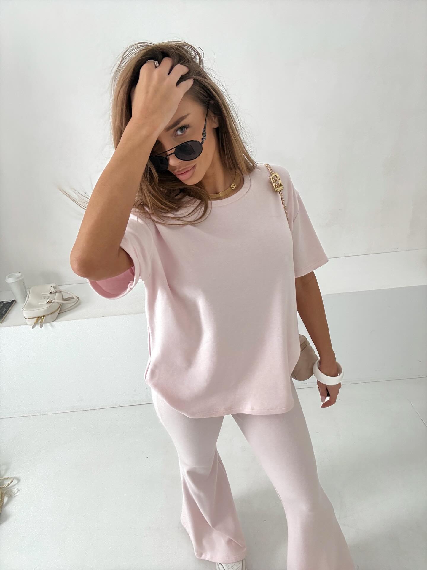 - Góra: Luźny T-shirt o kroju oversize z subtelnie obniżoną linią ramion, który zapewnia pełną swobodę ruchów i nowoczesny wygląd.