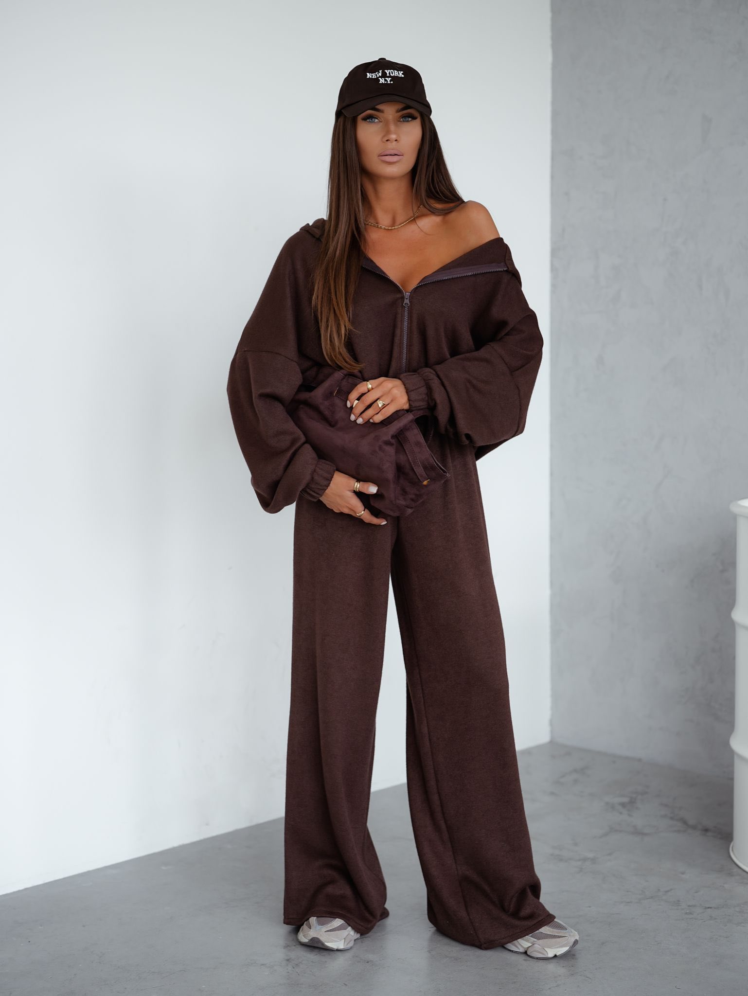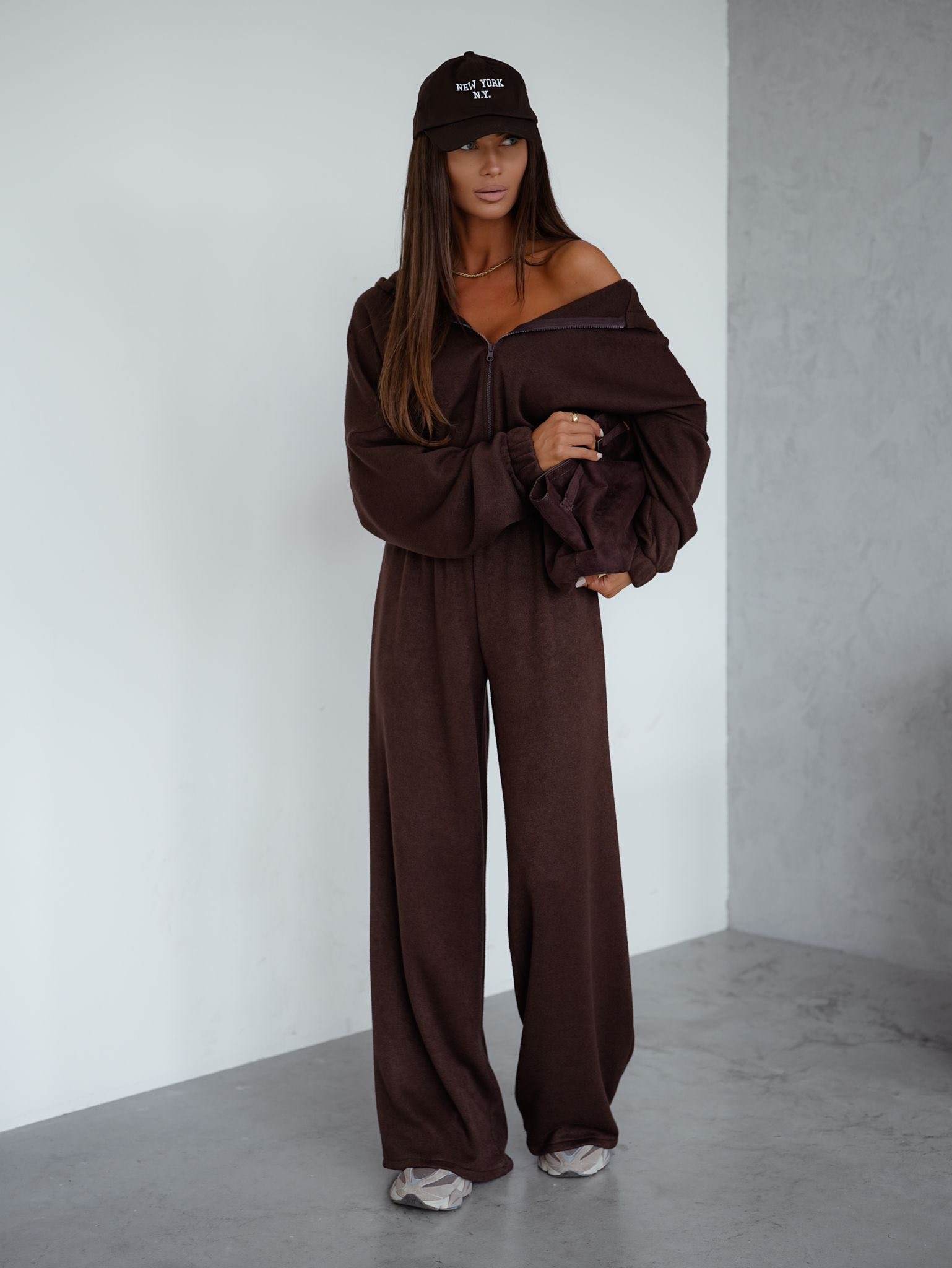 Wygoda spotyka styl w naszym sweterkowym komplecie . Ten dwuczęściowy zestaw w głębokim, czekoladowym odcieniu to idealne połączenie komfortu i kobiecego szyku. Góra z długim rękawem i suwakiem pozwala nosić ją na wiele sposobów – rozpiętą lub zapiętą, luźno lub dopasowaną. Szerokie spodnie z wysokim stanem subtelnie podkreślają sylwetkę, zapewniając swobodę ruchów.