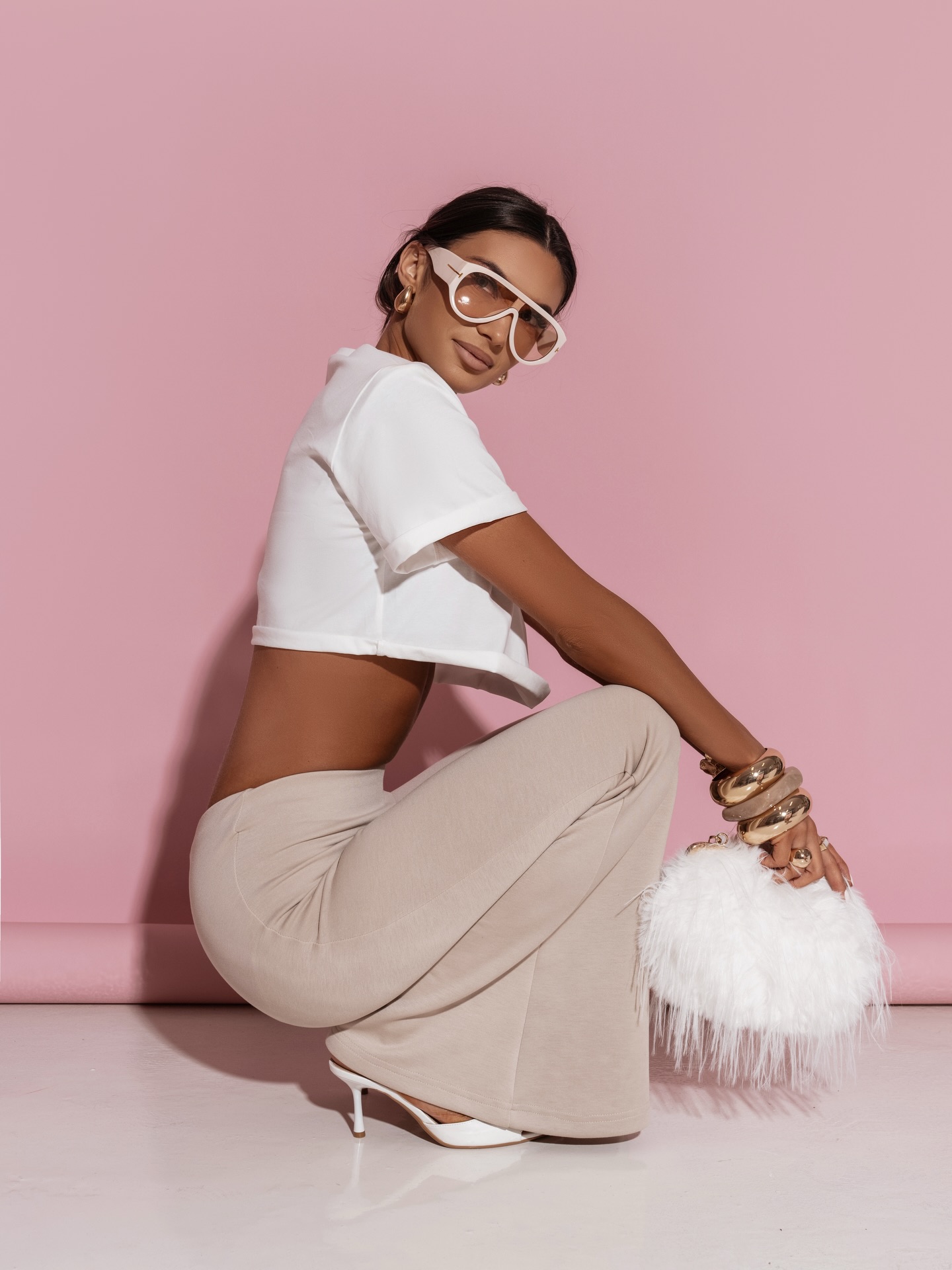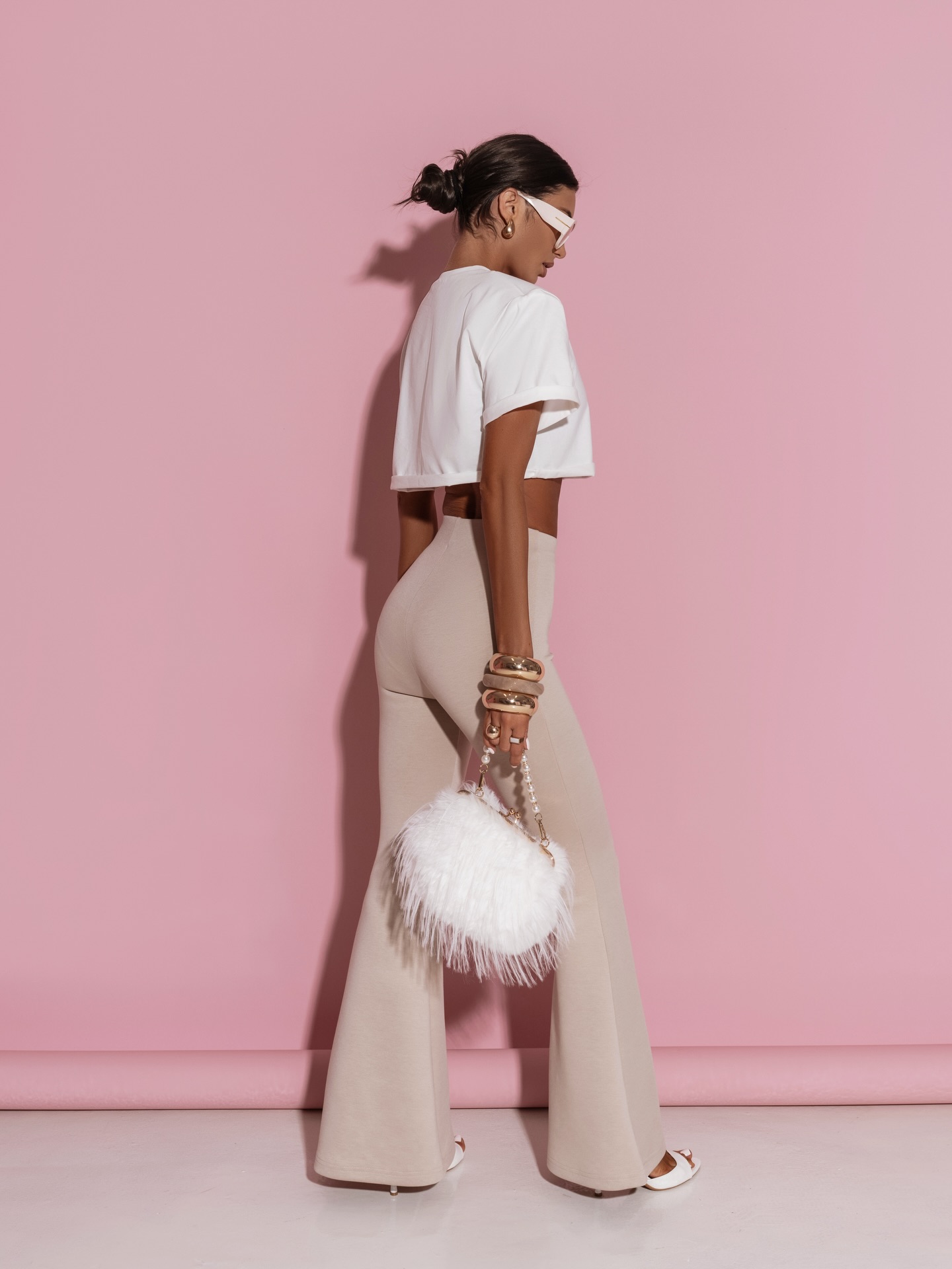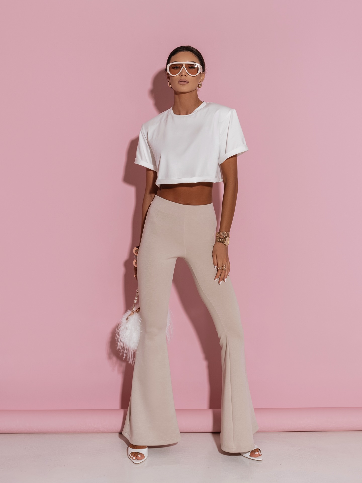 Stylowe legginsy w pastelowym odcieniu beżu, które łączą wygodę z kobiecą elegancją. Model z wysokim stanem pięknie podkreśla talię i modeluje sylwetkę, zapewniając jednocześnie maksymalny komfort noszenia. Lekko rozszerzana nogawka typu flare nadaje całości nowoczesnego, fashionowego charakteru i optycznie wydłuża nogi. Elastyczny, gładki materiał idealnie dopasowuje się do ciała, sprawiając, że legginsy świetnie sprawdzą się zarówno w codziennych stylizacjach, jak i w bardziej modowych zestawach z crop topem czy bluzą.